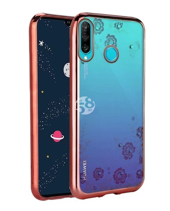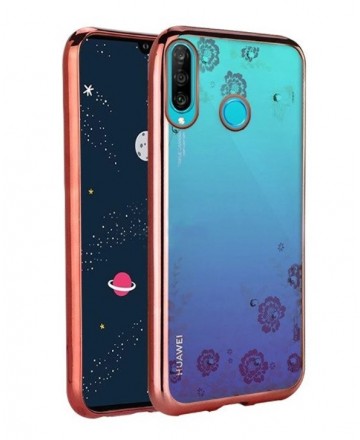 Луксозен силиконов гръб с цветя и камъни за Huawei P30 Lite Rose Gold
