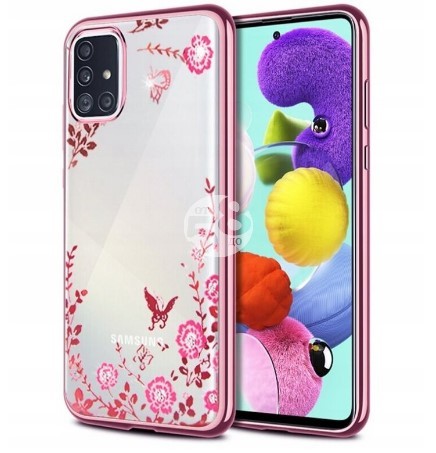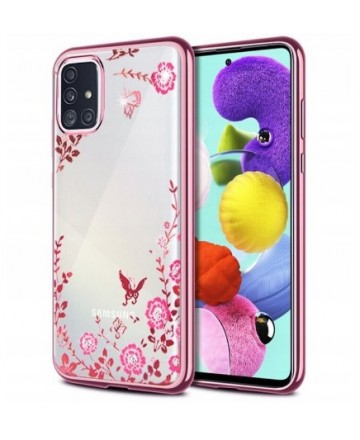 Луксозен силиконов гръб с цветя и камъни за Samsung Galaxy A51 Rose Gold